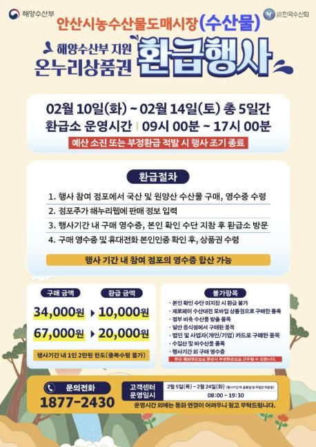 이번 행사는 안산시농수산물도매시장 수산동에서 진행되며, 행사 기간 중 국산수산물을 구매한 소비자에게 구입 금액의 최대 30%를 온누리상품권으로 환급해 주는 방식으로 운영된다.
