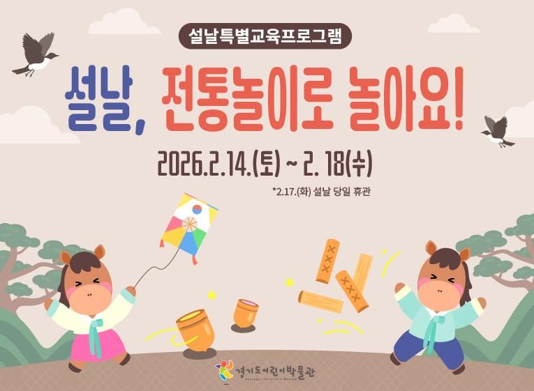 (뉴스폼) 경기문화재단 경기도어린이박물관은 설날을 맞이하여 2026년 2월 14일부터 2월 18일까지 설날 특별프로그램 '설날, 전통놀이로 놀아요!'를 운영한다. 설 연휴 동안 박물관을 방문하는 어린이와 동반 가족을 위해 가족 간의 유대감을 높일 수 있는 전통문화 체험프로그램 3종을 준비했다.