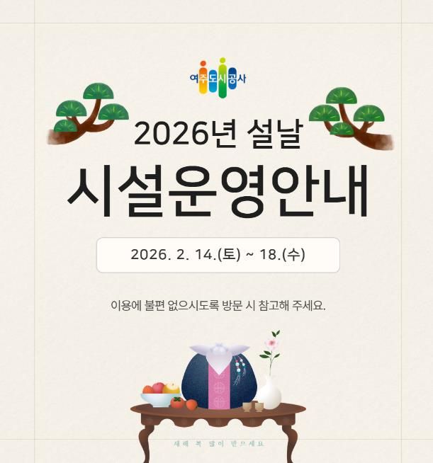 (뉴스폼) 여주도시공사가 다가오는 2026년 설 연휴를 맞아 시민과 귀성객들이 안전하고 편안한 명절을 보낼 수 있도록 주요 시설 운영시간 조정 및 특별 서비스를 시행한다고 밝혔다.