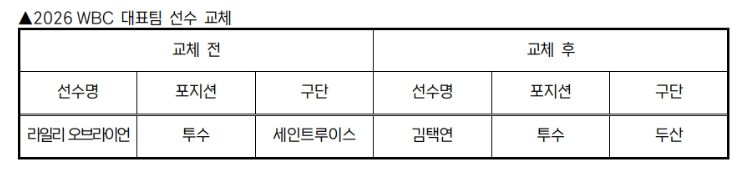(뉴스폼) KBO 전력강화위원회는 부상으로 인해 WBC 참가가 어려워진 세인트루이스 라일리 오브라이언을 대체할 선수로 두산 김택연을 확정하고 WBC 조직위에 선수 교체 승인을 요청했다.