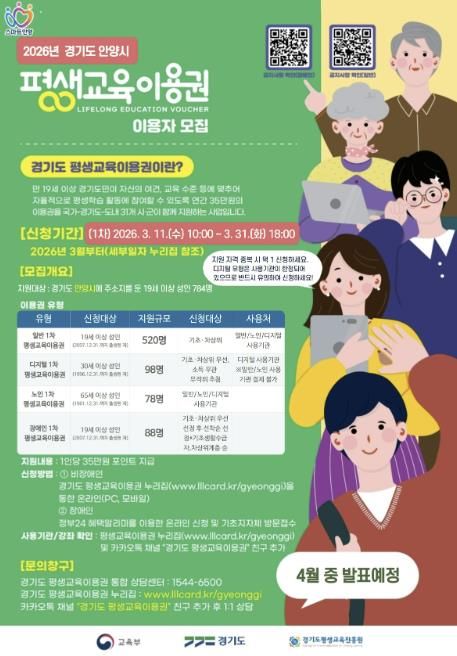 (뉴스폼) 안양시는 저소득층, 어르신, 장애인 등 교육 취약계층의 평생학습 기회를 보장하기 위한 총 3억 원 규모의 ‘2026년 평생교육 이용권(바우처) 지원사업’을 추진한다고 11일 밝혔다.