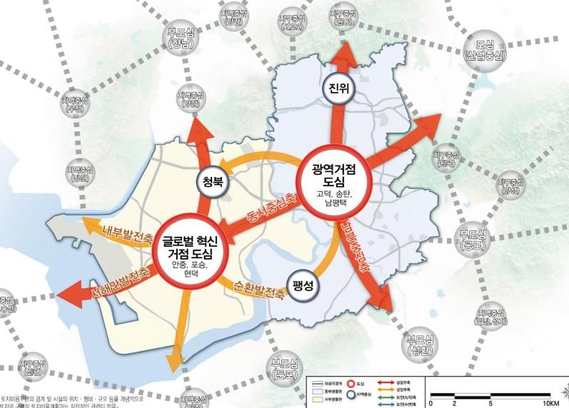 동부 생활권은 첨단산업과 연구개발, 국제교류 기능을 중심으로 경쟁력을 강화하고, 서부 생활권은 평택항과 연계한 물류, 수소산업, 해양관광 기능을 중심으로 육성할 계획이다. 각 권역의 특성을 살리면서도 상호 연계되는 발전체계를 구축해 특정 지역에 기능이 집중되지 않도록 하고, 평택 전역의 동반성장을 유도한다는 방침이다.