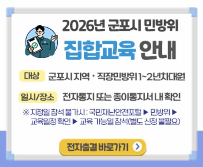 (뉴스폼) 군포시는 민방위대원의 비상 시 대응 역량 강화를 위해 ‘2026년 민방위 기본교육’을 실시한다.