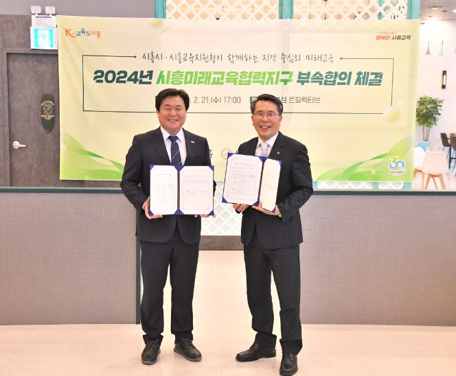 시흥시와 시흥교육지원청이 지난 21일 시흥 거북섬 르컬렉티브에서 ‘2024년 시흥미래교육협력지구’ 사업 추진을 위해 부속 합의를 체결했다. 시흥미래교육협력지구는 경기도교육청과 협약으로 지정한 지역이다.