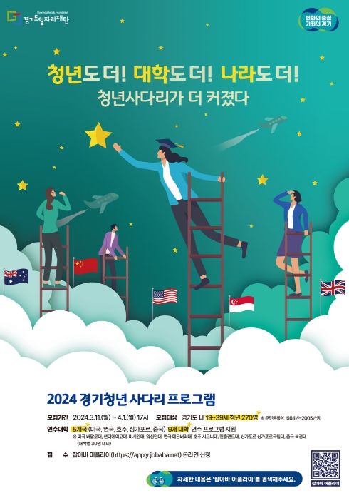 경기도와 경기도일자리재단이 3월 11일부터 4월 1일까지 경기도 청년에게 미국 등 해외연수 경험을 제공하는 ‘경기청년 사다리 프로그램’ 사업 참여자 270명을 공개 모집한다고 10일 밝혔다.