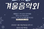(뉴스폼) 용인특례시 동천도서관은 18일 오후 5시부터 6시까지 동천도서관 지하 1층 책마당(열람형 계단공간)에서 ‘도시숲 겨울 음악회’를 연다고 밝혔다. 이번 음악회는 겨울 분위기에 맞춰 도서관의 색다른 공간에서 모든 세대가 함께 즐길 수 있도록 클래식, 재즈, 영화 오리지널사운드트랙(OST), 캐롤 등이 연주된다. 동천도서관 홈페이지에서 좌석 신청을 받고 있으며, 18일 현장 참여도 가능하다. 도서관 관계자는 해당 프로그램이 “시민에게 도서관 공간을 활용한 문화 행사를 제공할 좋은 기회”라며 “앞으로도 시민의 목소리에 귀 기울이며, 새롭고 다양한 문화 행사를 제공하는 데 힘쓰겠다”고 말했다.