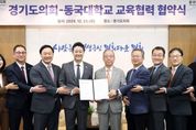 (뉴스폼) 경기도의회는 23일 오전 의장 접견실에서 동국대학교와 교육협력 및 학술교류를 위한 업무협약(MOU)을 체결했다. 이날 협약식에는 김진경 의장(더민주, 시흥3)과 고준호 의원(국민의힘·파주1), 김완규 의원(국민의힘·고양12), 이병숙 의원(더민주·수원12), 박호순 의정국장이 참석했다. 동국대학교에서는 윤재웅 총장, 김용현 교무부총장, 김승용 대학원장, 유한림 BMC(바이오메디캠퍼스) 행정처장 등이 함께 자리해 협약의 의의를 더했다. 양 기관은 이번 협약을 계기로 ▲의정 발전을 위한 정보 교류 ▲전문 인재 양성을 위한 교육·연구 지원 ▲도의원 및 의회 직원 대상 대학원 장학금 지원 등 의정 활동 역량 강화를 위한 체계적인 교육 협력에 나서기로 했다. 윤재웅 총장은 “대학의 교육·연구 역량을 공유함으로써 경기도 발전에 기여할 수 있게 되어 뜻깊다”며 “경기도의회와의 지속적인 협력을 통해 실효성 있는 교육 지원을 이어갈 수 있도록 최선을 다하겠다”라고 말했다. 김진경 의장은 “의회에 대한 도민의 기대는 점점 더 복잡해지고 다양화되고 있는 만큼 의회 구성원 모두가 더 많이 배우려는