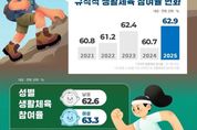 (뉴스폼) 문화체육관광부는 만 10세 이상인 국민 9천 명을 대상으로 시행한 ‘2025년 국민생활체육조사’ 결과를 발표했다. 2025년 생활체육 참여율(주 1회, 30분 이상)은 62.9%로, 전년 대비 2.2%포인트(p) 상승했다. 특히 주 2회 이상 참여율은 52.2%로 2.7%포인트(p) 증가했다. 연령대별로는 20대부터 60대까지의 참여율은 65% 내외로 비교적 고르게 나타났으나, 10대(43.2%)와 70대 이상(59.5%)은 다른 연령대에 비해 낮은 수준을 보였다. 주요 참여 종목은 걷기(40.5%), 보디빌딩(17.5%), 등산(17.1%) 순으로 나타났다. 이 중 등산은 전년 대비 5.0%포인트(p) 증가해 참여 비중의 증가 폭이 가장 컸다. 주로 참여하는 체육활동(1+2+3순위) 1회 평균 참여 시간은 ‘1시간~1시간 30분 미만’이라고 응답한 비율이 67.3%로 가장 높았다. 최근 1년간 체육활동 참여 기간이 ‘9개월 이상’이라고 응답한 비율은 91.4%였다. 규칙적 참여자의 평균 참여 기간은 14개월로, 전년(11개월) 대비 증가한 것으로 나타났다. 체육활동 장소로는 공공체육시설