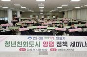 (뉴스폼) 양평군은 지난 4일 오후 3시 양평군청 대회의실에서 ‘청년친화도시 조성을 위한 미래 방향성과 차별화 전략’을 주제로 ‘23-30 매력 양평 만들기’ 정책세미나를 개최했다. 이번 세미나는 청년이 머물고 싶은 도시, 청년이 주도적으로 참여할 수 있는 ‘매력양평’ 구현을 위한 실질적인 정책 방향을 논의하고자 마련됐다. 이날 행사에는 전진선 양평군수를 비롯해 양평군의회, 양평군 정책자문단, 청년정책위원회, 청년단체 등 관계자 100여 명이 참석했다. 1부에서는 인사말씀과 축사, 기념촬영이 진행됐으며, 2부에서는 손신 교수(아신대학교, 양평군 정책자문단 위원)의 ‘청년친화도시 조성을 위한 미래 방향성 및 차별화 전략’과 길청순 이사장(지역농업네트워크 서울경기제주협동조합, 양평군 정책자문단 위원)의 ‘농업·농촌의 미래와 청년농업인’ 발제가 이어졌다. 전진선 양평군수는 “청년이 머물고 싶은 도시, 청년이 주도적으로 참여할 수 있는 ‘매력양평’을 만들기 위해 행정과 지역사회가 함께 힘을 모아야 한다”며 “오늘 세미나에서 제시된 다양한 의견을 향후 청년정책에 적극 반영하겠다”고 밝혔다. 한편, 양평군은