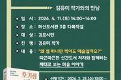 (뉴스폼) 김포시 마산도서관은 오는 4월 11일 오후 2시부터 4시까지 ‘토요시독회’ '호기심 미술책방'을 운영한다. ‘토요시독회’는 최근 출간된 신간도서를 중심으로 저자와 시민이 만나 책의 내용을 깊이 있게 나누는 독서문화 프로그램이다. 이번 강의는 '호기심 미술책방'의 저자 김유미 작가가 진행한다. 미술교육을 전공하고 현직 교사로 재직 중인 김유미 작가는 다양한 교육 현장에서의 경험을 바탕으로 시민들과 미술에 대한 이야기를 나눌 예정이다. 강연은 ‘드로잉으로 여는 미술 인문학’을 주제로 진행된다. 컨투어 드로잉과 현대미술 사례를 통해 예술을 새롭게 바라보는 시각을 나누고, 일상에서 미술을 보다 쉽게 감상할 수 있는 방법을 소개한다. 강의 신청은 2월 25일 수요일 오전 10시부터 김포시 통합예약 홈페이지 또는 방문 접수를 통해 가능하며, 김포시민 50명을 선착순으로 모집한다.