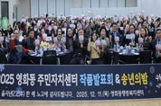 (뉴스폼) 수원시 장안구 영화동은 지난 11일, 동 행정복지센터 3층 대강당에서 한 해 동안 갈고닦은 실력을 뽐내고 올 한 해를 돌아보는 ‘2025 영화동 주민자치센터 작품발표회 & 송년의 밤’을 개최했다. 이번 행사는 영화동 주민자치회와 단체장협의회가 연계하여 ‘작품발표회’와 ‘송년의 밤’을 함께 개최해서 더욱 의미 있는 행사였다. 작품발표회에는 10개 팀이 참여해 그동안 배운 실력을 마음껏 선보였으며, 이어진 송년의 밤 행사에서는 각 단체를 대표하는 4개 팀이 장기자랑 무대를 선보여 행사에 참여한 주민들에게 큰 기쁨과 즐거움을 선사하기도 했다. 박성대 주민자치회장은 “1년 동안 열정을 다해 멋진 발표회를 준비한 수강생들에게 감사드리며 이번 행사가 주민자치센터 프로그램 활성화의 계기가 되기를 바란다“고 말했다. 추혜경 영화동장은 ”앞으로도 주민들이 만족할 수 있도록 주민자치센터 프로그램의 활성화를 위한 다양한 지원을 아끼지 않을 것이며 내년에도 영화동 주민 모두가 행복하시길 바란다“고 전했다.