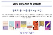 (뉴스폼) 양평군은 11월 1일부터 12월 31일까지 용문도서관에서 ‘한 해의 끝, 나를 돌아보는 시간’을 주제로 한 책 추천 서비스(북 큐레이션)를 운영한다고 밝혔다. 이번 책 추천 서비스(북 큐레이션)는 한 해를 마무리하며 자신을 돌아보는 시간을 갖자는 취지로 기획됐으며, 자기 이해와 성찰을 도와줄 도서 8권이 선정됐다. 선정 도서는 △김수현의 『나는 나로 살기로 했다』 △김이나의 『보통의 언어들』 △전승환의 『내가 원하는 것을 나도 모를 때』 △기시미 이치로·고가 후미타케의 『미움 받을 용기』 △법륜의 『인생수업』 △알랭 드 보통의 『왜 나는 너를 사랑하는가』 △추적의 『명심보감』 △지아 톨렌티노의 『트릭 미러』 등이다. 용문도서관은 도서관 내 전시 공간을 마련해 선정 도서를 전시하고, 각 작품의 주요 내용을 소개하는 안내문도 함께 비치할 예정이다. 전진선 양평군수는 “이번 책 추천 서비스(북 큐레이션)가 바쁜 일상 속에서 자신을 돌아보는 계기가 되길 바란다”며 “앞으로도 다양한 주제의 프로그램을 통해 군민과 함께하는 도서관이 되도록 노력하겠다”고 말했다.
